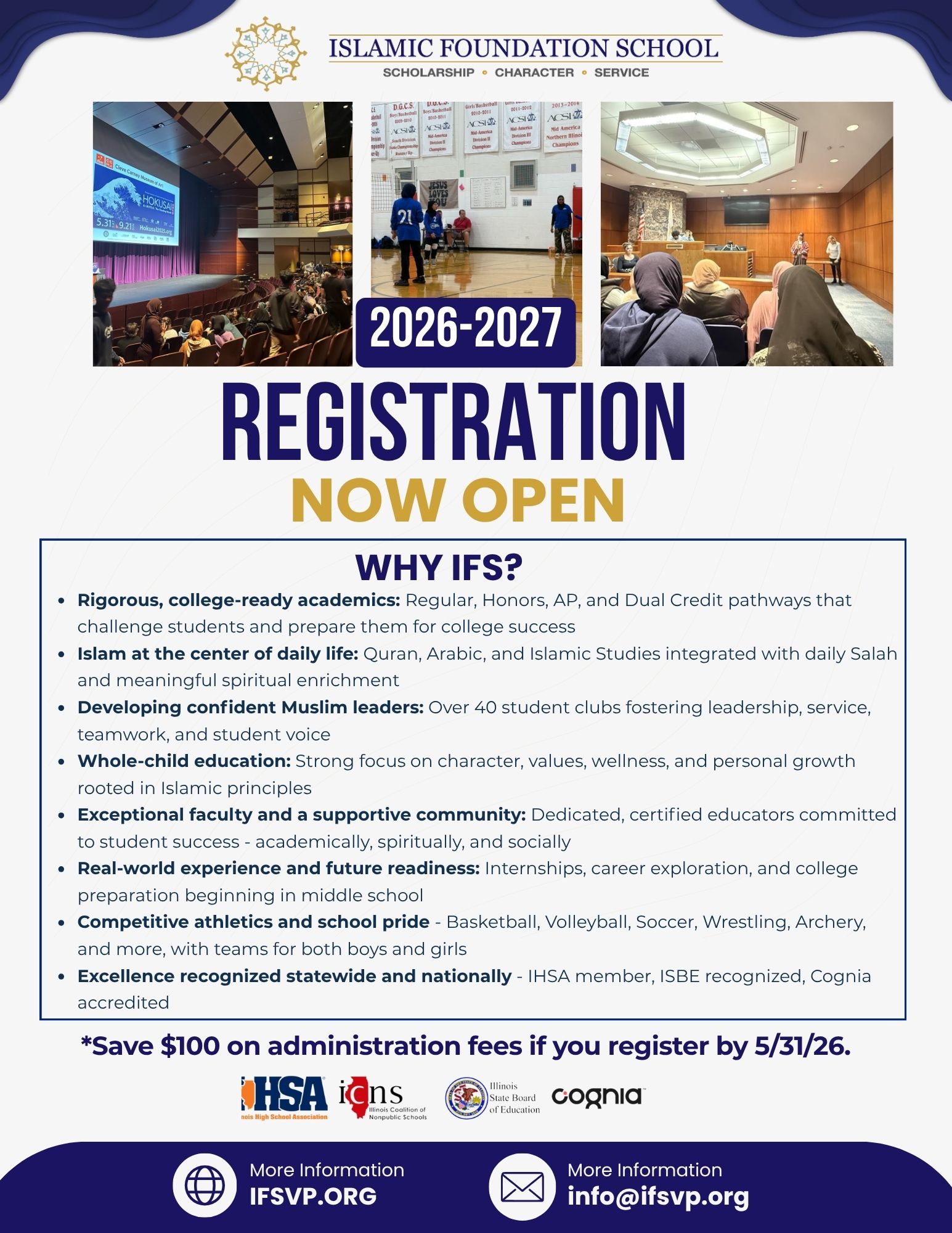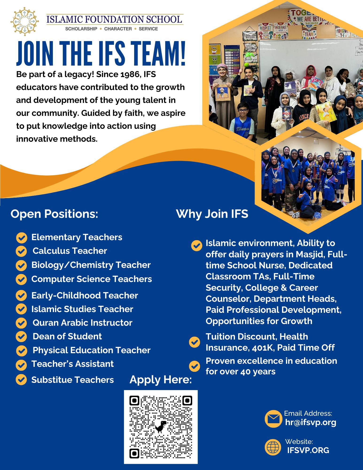 Islamic Foundation School aims to provide learning experiences and teachers that develop our students in scholarship, character, and service. IFS is committed to developing and delivering a well-rounded educational program for all its students. We believe this includes rigorous academics, varied co-curricular programs, and an effective partnership between home and school.